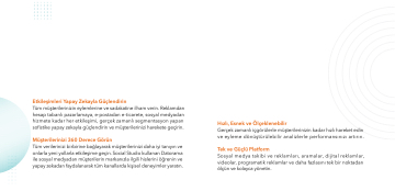 Etkileşimleri Yapay Zekayla Güçlendirin Tüm müşterilerinizin eylemlerine ve sadakatine ilham verin. Reklamdan hesap tabanlı pazarlamaya, e-postadan e-ticarete, sosyal medyadan hizmete kadar her etkileşimi, gerçek zamanlı segmentasyon yapan sofistike yapay zekayla güçlendirin ve müşterilerinizi harekete geçirin. Müşterilerinizi 360 Derece Görün Tüm verilerinizi birbirine bağlayarak müşterilerinizi daha iyi tanıyın ve onlarla yeni yollarla etkileşime geçin. Social Studio kullanan Datorama ile sosyal medyadan müşterilerin markanızla ilgili hislerini öğrenin ve yapay zekadan faydalanarak tüm kanallarda kişisel deneyimler yaratın. Hızlı, Esnek ve Ölçeklenebilir Gerçek zamanlı içgörülerle müşterilerinizin kadar hızlı hareket edin ve eyleme dönüştürülebilir analizlerle performansınızı artırın. Tek ve Güçlü Platform Sosyal medya takibi ve reklamları, aramalar, dijital reklamlar, videolar, programatik reklamlar ve daha fazlasını tek bir noktadan ölçün ve kolayca yönetin.